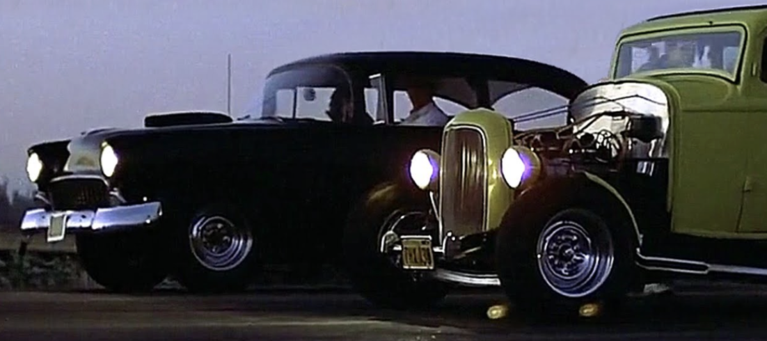 The 1973 classic American Graffiti, is George Lucas’ ode to his teenage years in the early 1960s in Southern California, complete with sock-hops, romantic drama, submarine races, drive-in burger joints, and illegal drag races. This Boomer Era film-gem was directed and co-written by Lucas just before he became a superstar director famous for the Star Wars trilogy. The movie concludes with the ultimate drag race between hot-rodder John Milner (Paul Le Mat) driving a ’32 Deuce Coupe vs. his challenger, Bob Falfa (Harrison Ford) who’s driving a suped-up 1955 Chevy Bel Air. Spoiler Alert! Falfa ends up crashing the beautiful machine, but the memory of this heartfelt and romantic film lives on.